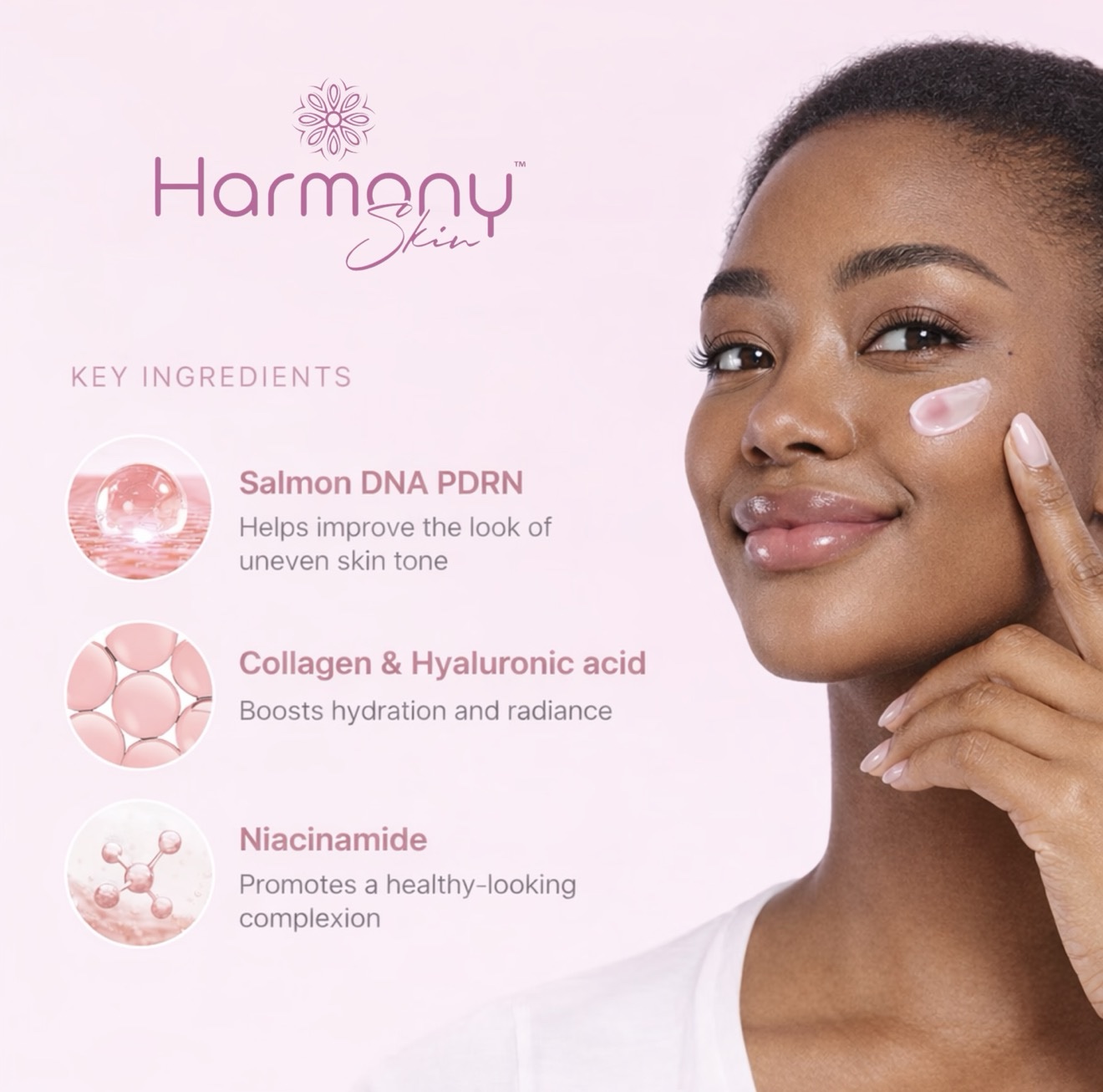 Discover HarmonySkin™ PDRN Pink Collagen Capsule Cream (55g) – an exclusive, premium moisturiser designed to deliver a smooth, glass-like glow. Soft pink capsules melt into a lightweight cream with PDRN (Salmon DNA), Hyaluronic Acid and 5% Niacinamide for deep hydration, brighter tone and firmer-looking skin.